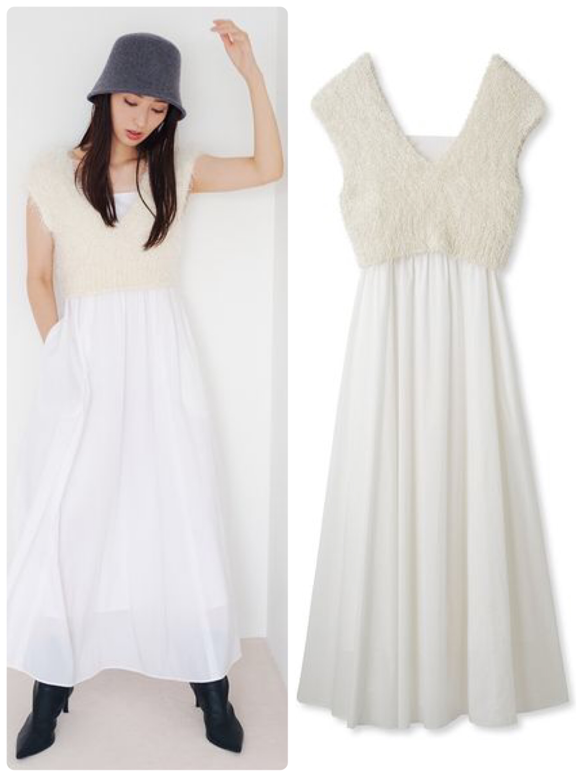 フッワフワのファーライクなベストとキャミワンピースがセットになった、カジュアルドレス。暑い時期から着られるよう、ニットベストもドライタッチな糸で作られているのだとか。モノトーン小物で締めて、モードに。ファーライクニットベスト&キャミワンピース/スナイデル