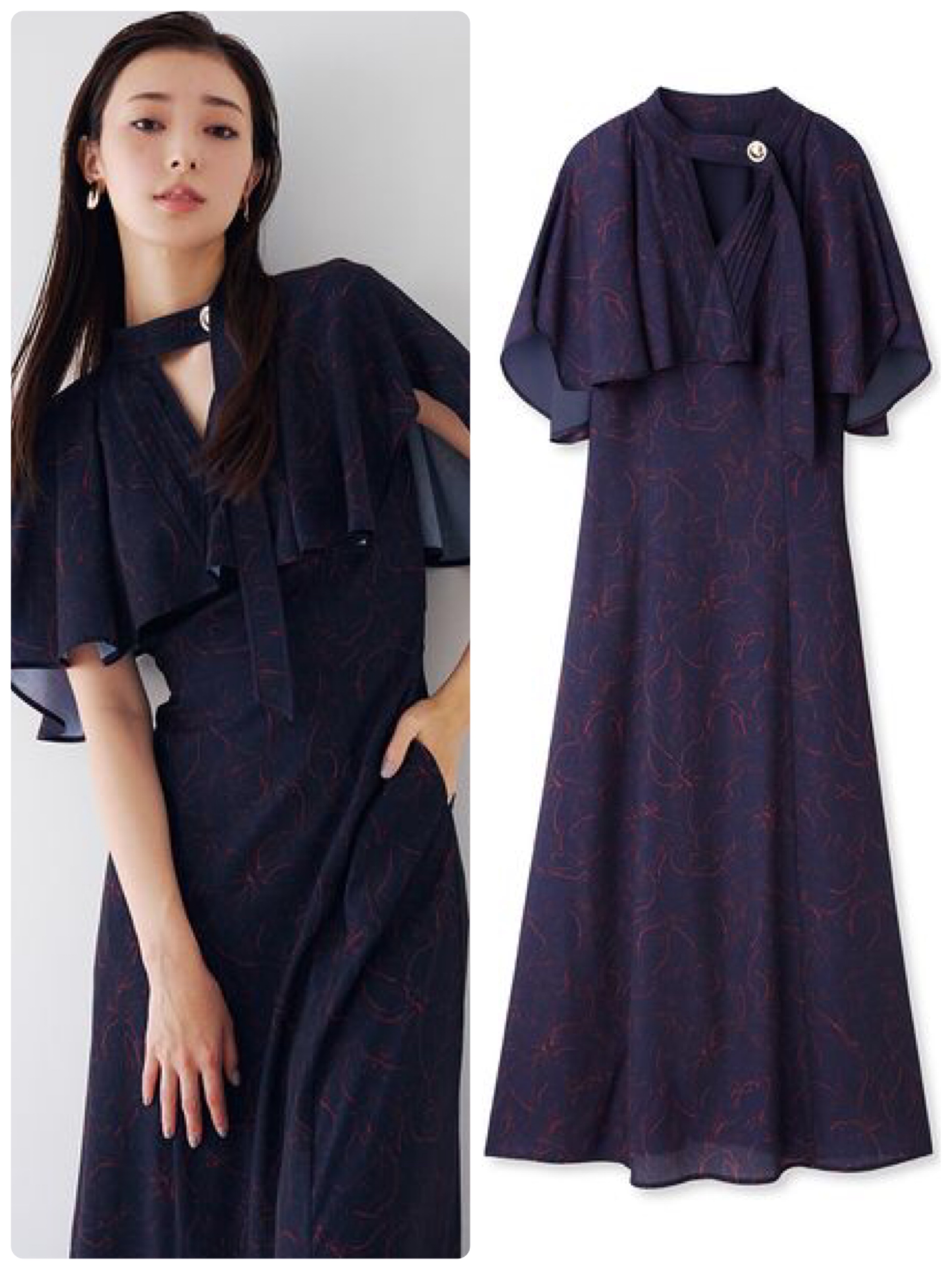 エレガントなケープのような袖が印象的なドレスも、クールなヘアメイクでモダンに。ネイビー&スタイリッシュな柄で、知的な雰囲気が倍増。ケープフリルパイピングプリントワンピース/スナイデル