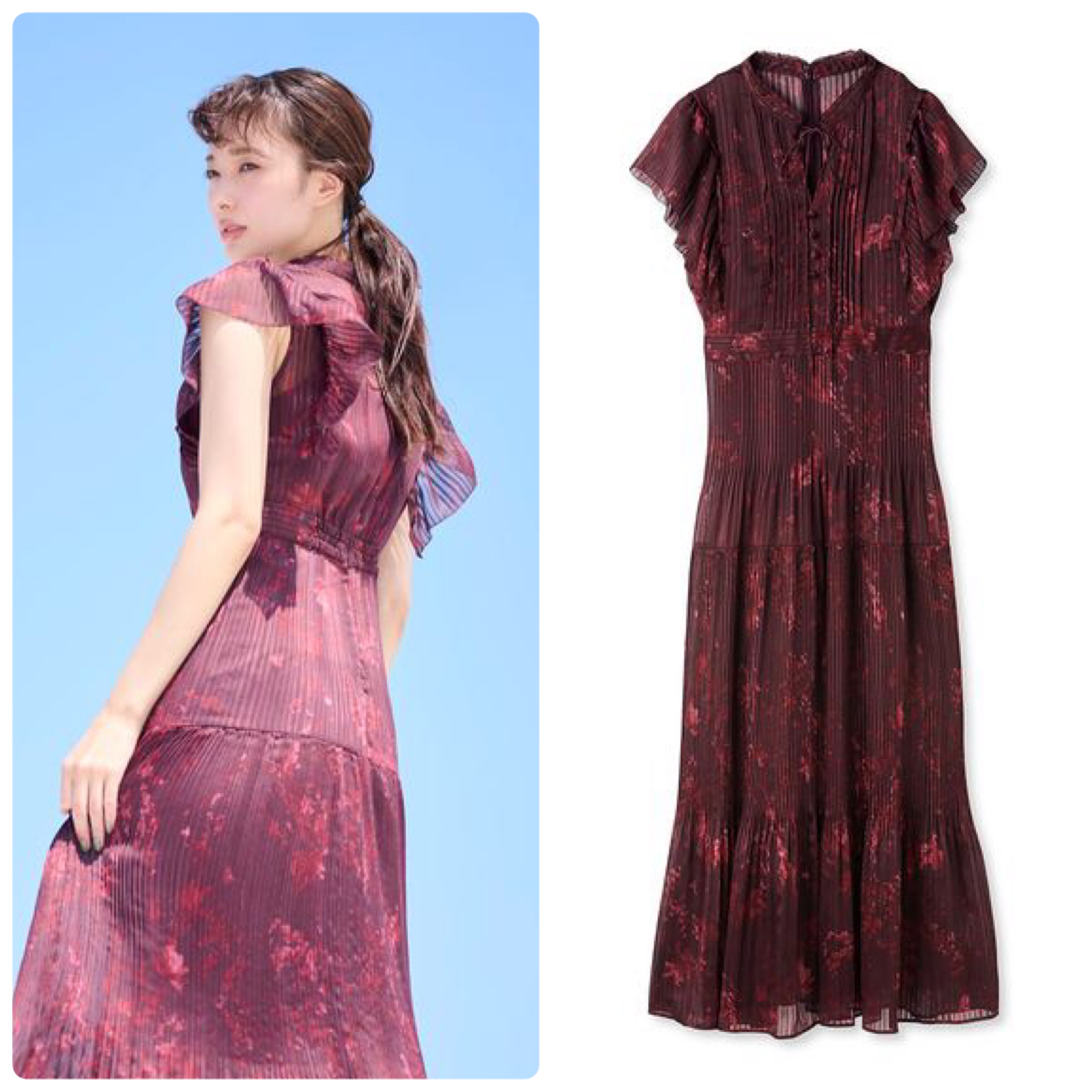 女性らしいボディーラインが素敵な茉由ちゃん。プリーツがたっぷり入ったプリントワンピースを、色っぽく着こなしています。落ち感のある生地を使ったほっそり見えるデザインで、さらにスタイル良く見えます。プリーツプリントワンピース/フレイアイディー