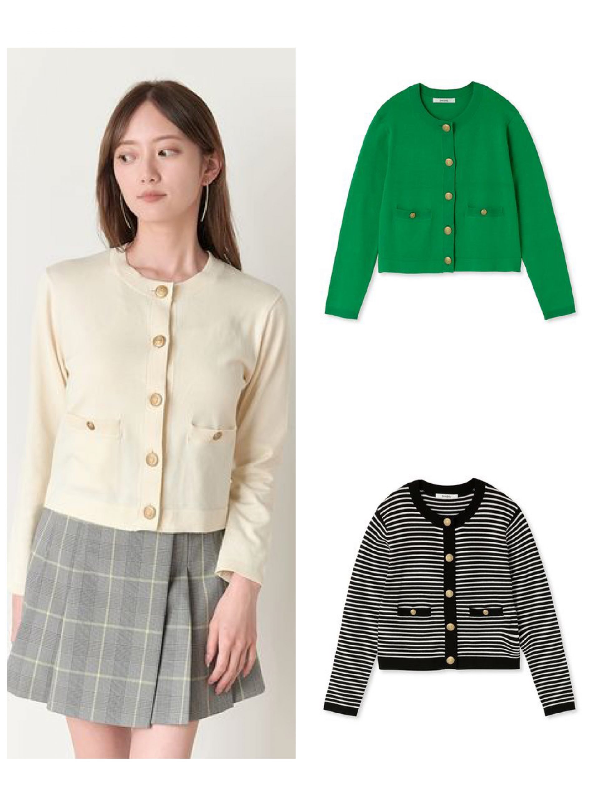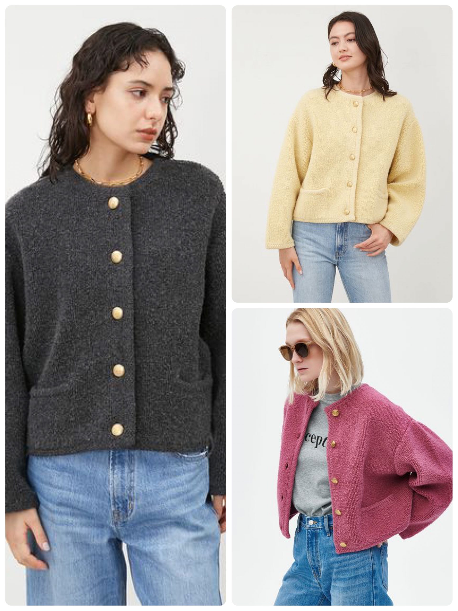 モコモコのパイルなようなニット素材で作れられた、カラフルな色味のショート丈のニットジャケット。こちらもゴールドボタンがおしゃれなポイントになっています。パイル編みショート丈金釦ニットジャケット/ミラオーウェン