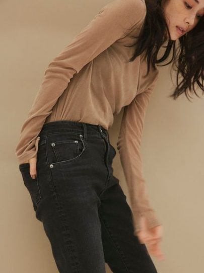 シアー感とベロアタッチの魅力をあわせもつフロッキープリントトップス。前はボートネック、後ろはUネックのバックコンシャスな肌見せデザインは、前後どちらでも着られる2way。ジレやジャケットインに合わせれば、秋らしさがぐっと高まります。