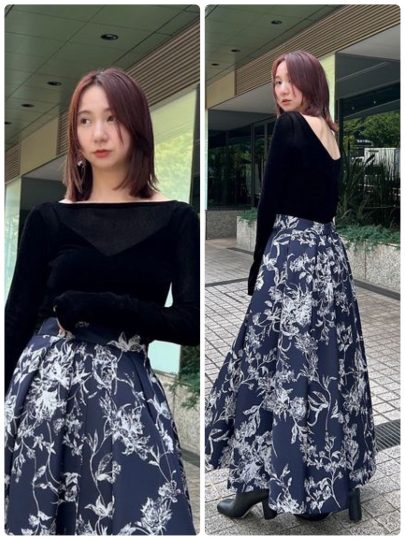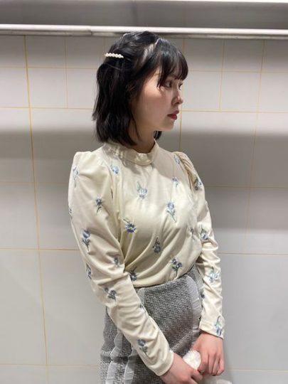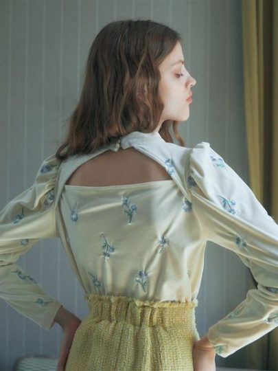ベロアのカットソー生地にオリジナルのコスモス柄を刺繍したトップス。襟ぐりは高めのスタンドカラーと、クルーネックにカッティングディテールのどちらを前にしても着用できる仕様。パフスリーブも愛らしく、メリハリのあるシルエットを演出してくれます。