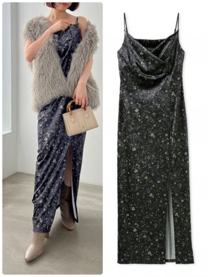 光沢感のあるクラッシュベロアに小花柄をプリントした、ヴィンテージライクなキャミワンピース。すとんとしたシルエットで、胸元のドレープがスタイルをカバー。サイドにあしらわれた深めのスリットでヘルシーな肌見せを演出できます。
