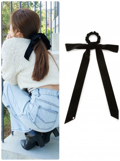 上品な光沢感のあるベロア素材のリボンがあしらわれた、シュシュ型のヘアゴム。たっぷりとした長さなので付けるだけで存在感があり、スタイリングのアクセントにぴったり。リボンの先端にはロゴ入りのプレートをあしらい、細部まで抜かりのない仕上がりに。
