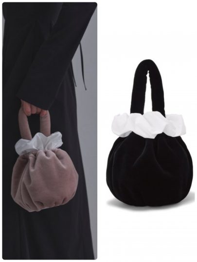 ベロア×シャツ生地の異素材MIX。中綿入りのバルーンのような丸いフォルムが可愛すぎ。裏地はサテン生地でインナーポケット付き。小さめながら、収納力もあり実用性も兼ね備えています。