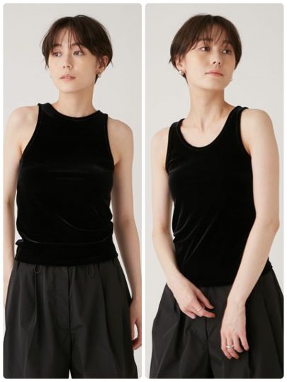 前後の異なるネックラインの開きを、どちらでもたのしめる2wayデザイン。シーズンムードを高めるベロア生地は、。程よい光沢が華やかな印象に。夏は一枚で、秋はジャケットやシャツのインナーとして重宝するアイテムです。