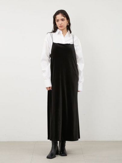 2本の華奢なストラップが女らしいキャミソールワンピ。やや光沢のあるしなやかなベロア生地が、エレガントで上品な表情を醸します。裾にかけてAラインに広がるシルエットは、身体のラインを拾いすぎないところも嬉しい。