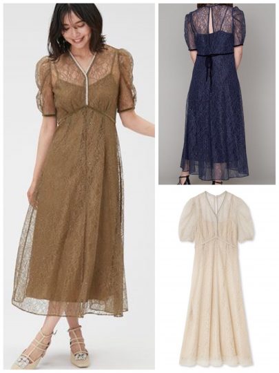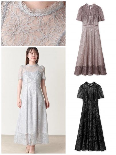 繊細なレースにラメの煌めきをプラスしてより華やかに。ウエストをキュッと絞り、裾に向かってフレアに広がるシルエットがメリハリをメイクしてくれます。くすみカラーで大人っぽく。