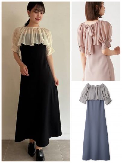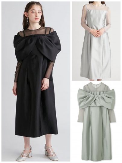 デコルテや腕が透ける長袖ワンピの上から、特大リボンを結んだような形のトップスを重ねたセットドレス。ふんわりボリュームのあるトップスとの対比で体が華奢に見えます。