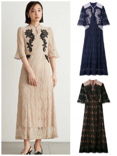 チャイナ風の襟やオリエンタルなムード漂うモチーフなど、定番のレースドレスもひとクセ効かせるのがリリーブラウン流。背中のリボンの結び具合でウエストを好みの細さに調整できます。