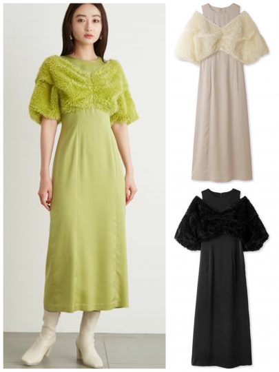 シンプルなIラインワンピとフェザーのようなふわふわトップスをセットに。重心が上がってスタイル良く見えるトップスは、前後逆に着たり、ジップを開けて羽織ったりとアレンジ自在。
