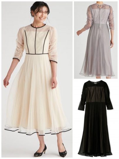 ごくごく小さなドット柄と甘さ控えめな色でチュールを大人仕様にシフト。身頃のサテンテープとスカート部分のプリーツが縦ラインを強調して、ほっそりした印象に導きます。