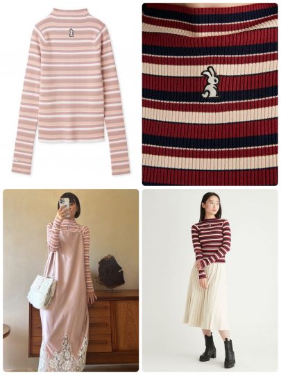 カラフルなマルチボーダーのリブニットは、キュートなウサギの刺しゅう入り。なんとしっぽがハート型なんだとか♡