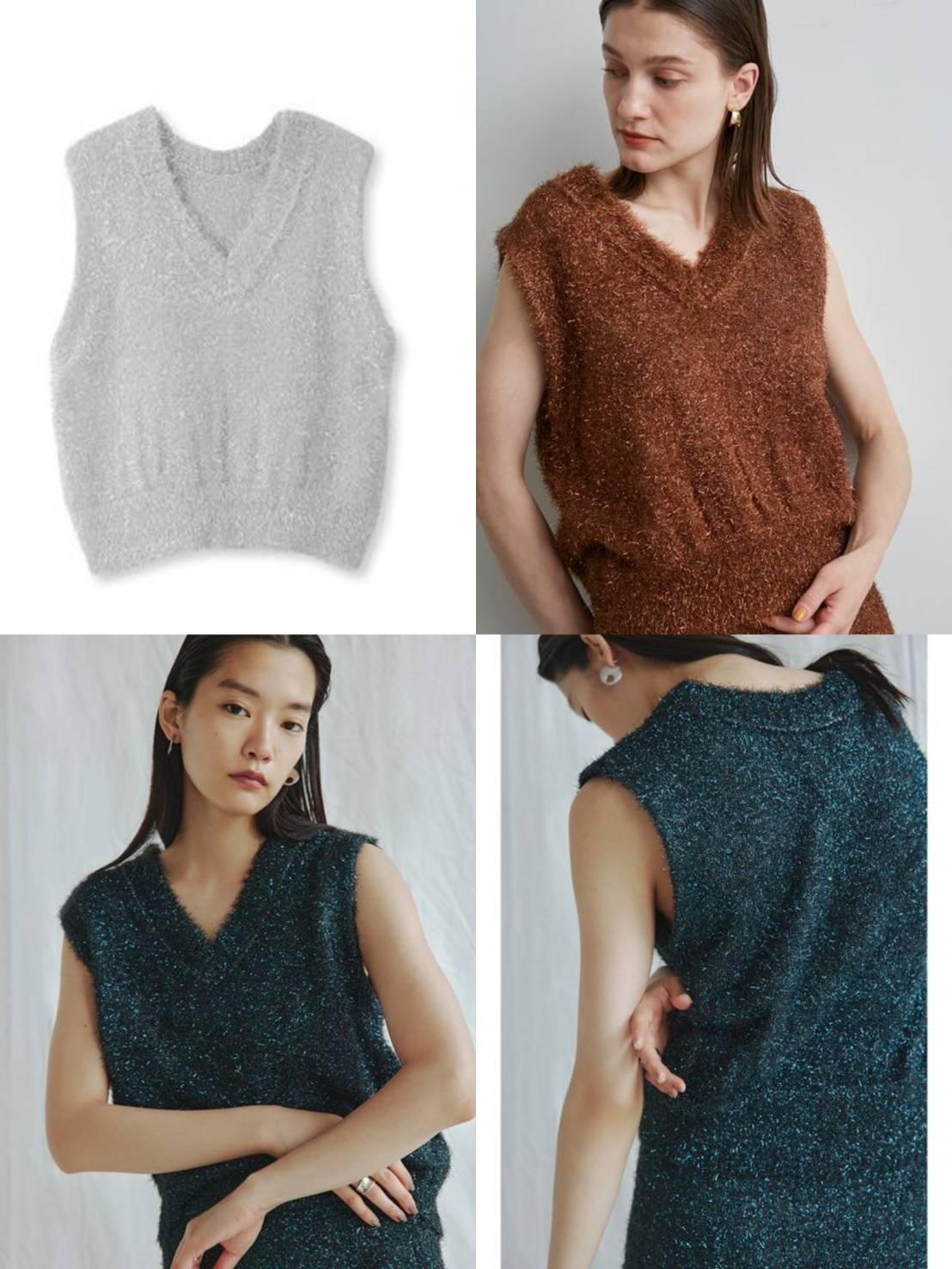まだ暑い時期は1枚で、秋になったらレイヤードアイテムとして活用できる、シックな色味のベスト。前後どちら側を前にしても着られる2WAY。ラメフェザーニット2wayベスト/styling/