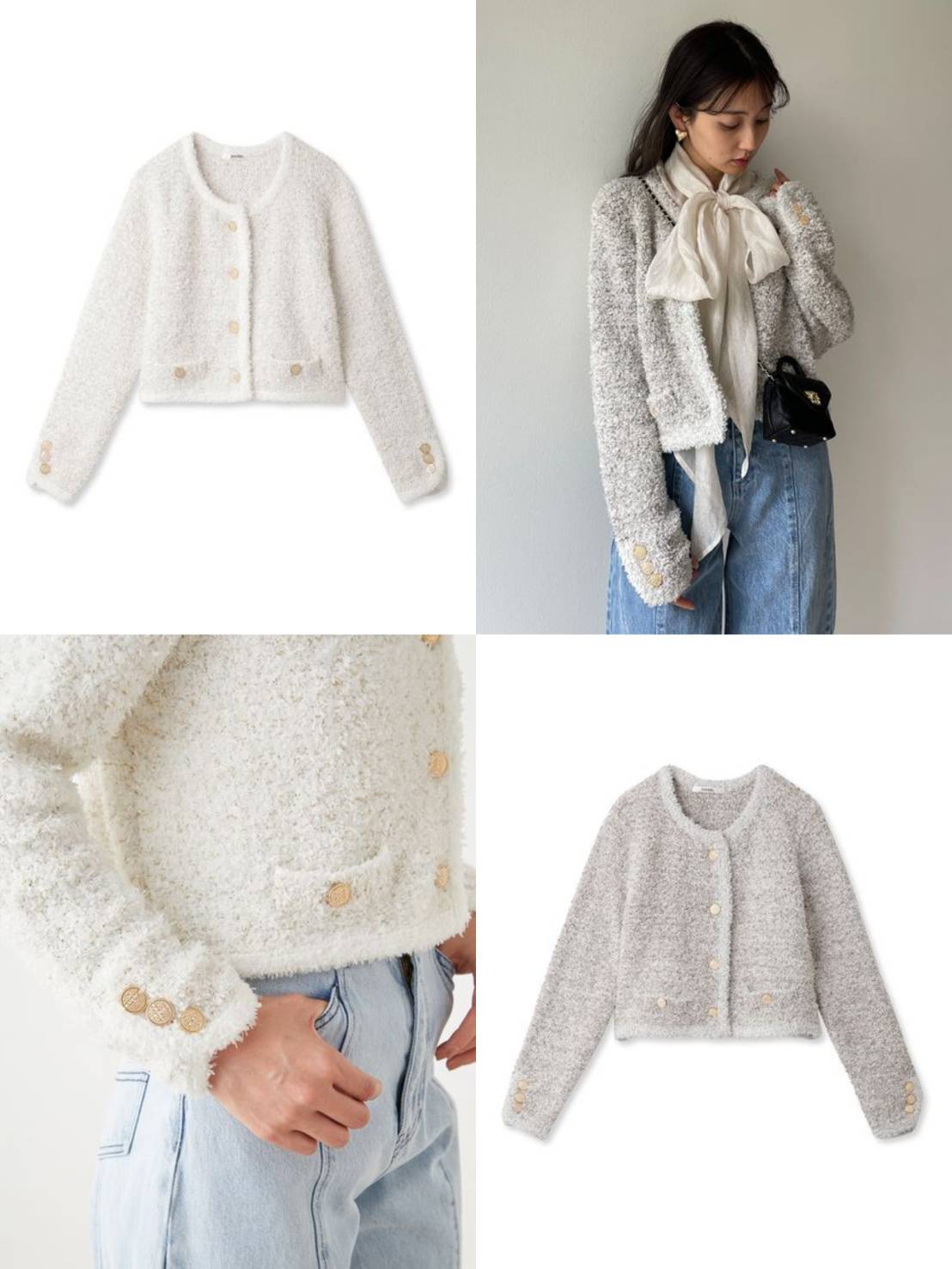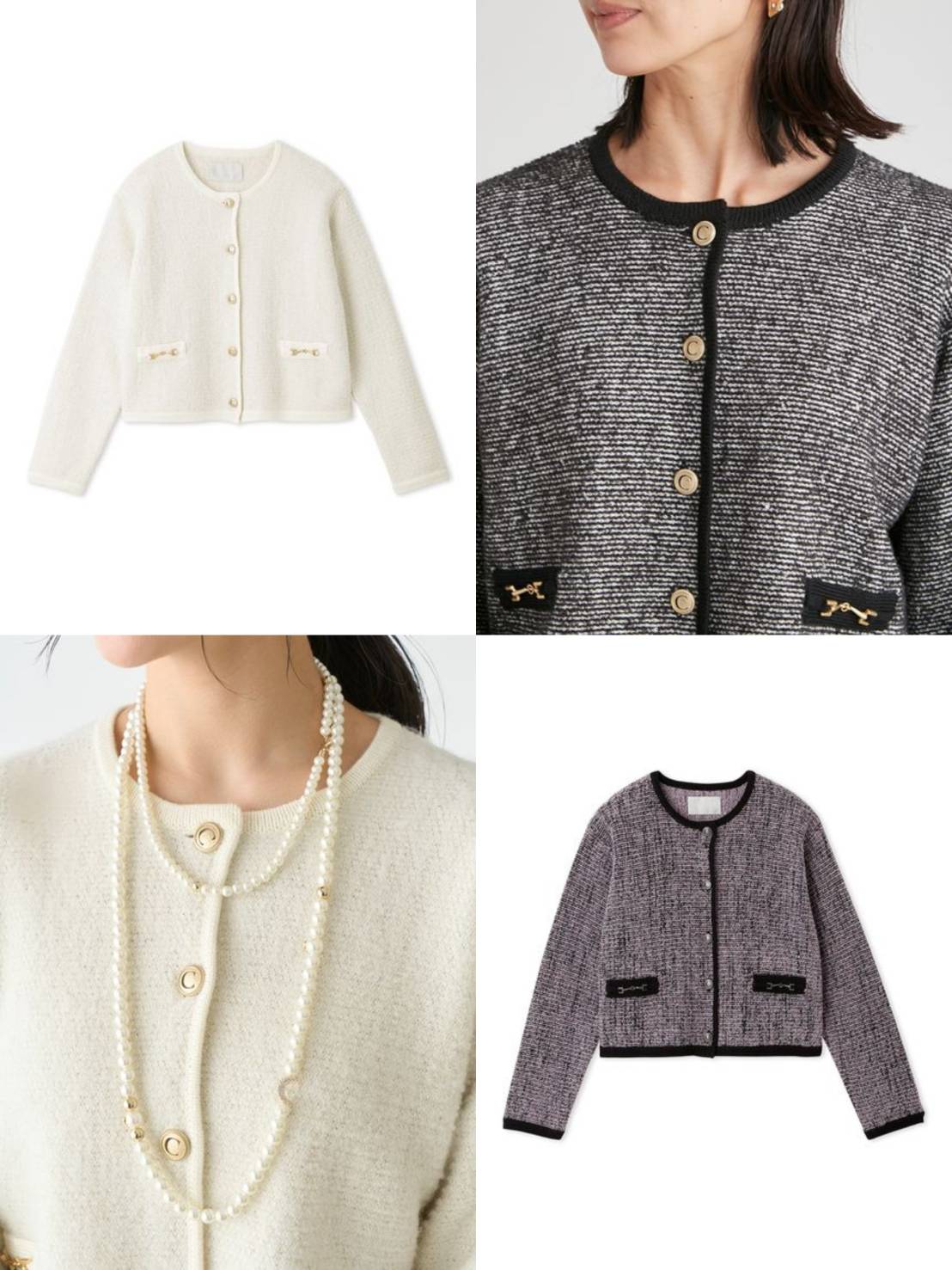 現在大ヒット中の、ラメ入りのツイードカーディガン。ポケットは袖口のメタルボタンなどレトロなディテールが際立つ本格仕様。それでいて¥12,980はお買い得なのでは。ラメツイードカーディガン/スナイデル