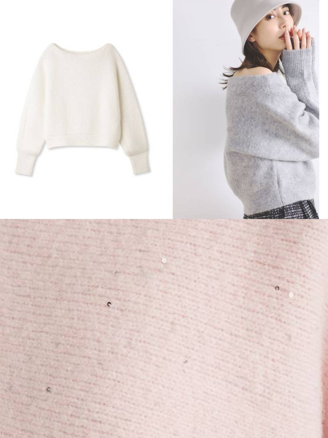 細かなスパンコールの入った糸とアルパカ混の糸を練り合わせて織られた、ドルマンスリーブニット。見た目がふわふわでキラキラで、男女問わずとってもモテそう。ファンシースパンコールヤーンニット/セルフォード