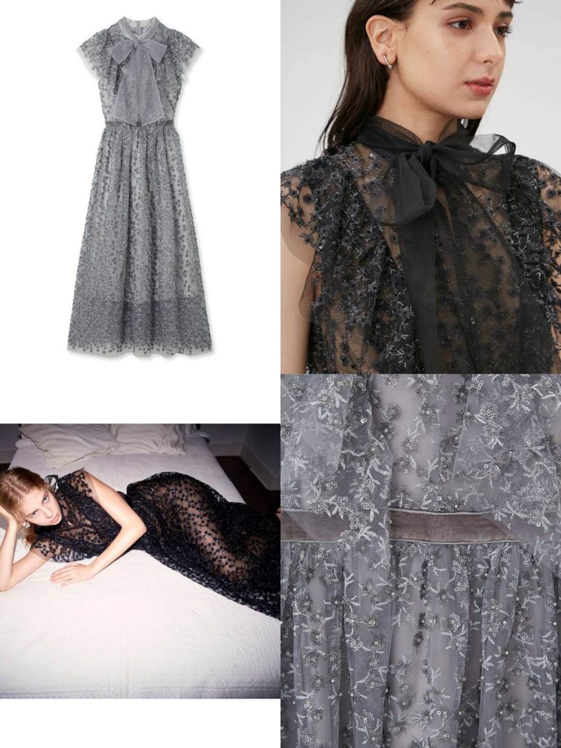 スパンコールがぎっしりと詰まった、FRAY I.Dらしいゴージャスなオケージョンドレス。黒は肌が透けてるように一瞬見えますが、裏地がゴールドっぽいベージュなため。パーティーや会食など特別な日にぴったりな華やかさです。グリッターシークインドレス/フレイアイディー