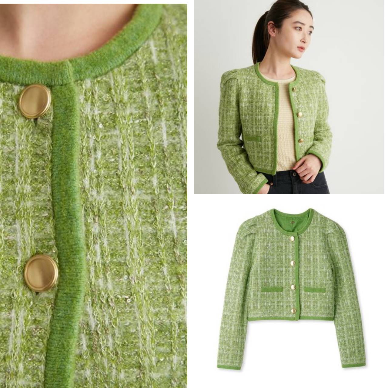 今シーズンマストのショート丈ニットジャケット。リリーブラウンのこのシリーズは、グリーンのみ極小スパンコールが上品に散りばめられた仕様になっています。デニム合わせなどのオフにも、きちんとしたオケージョンにも両方使えるのがすごい。バリエーションニットジャケット/リリーブラウン
