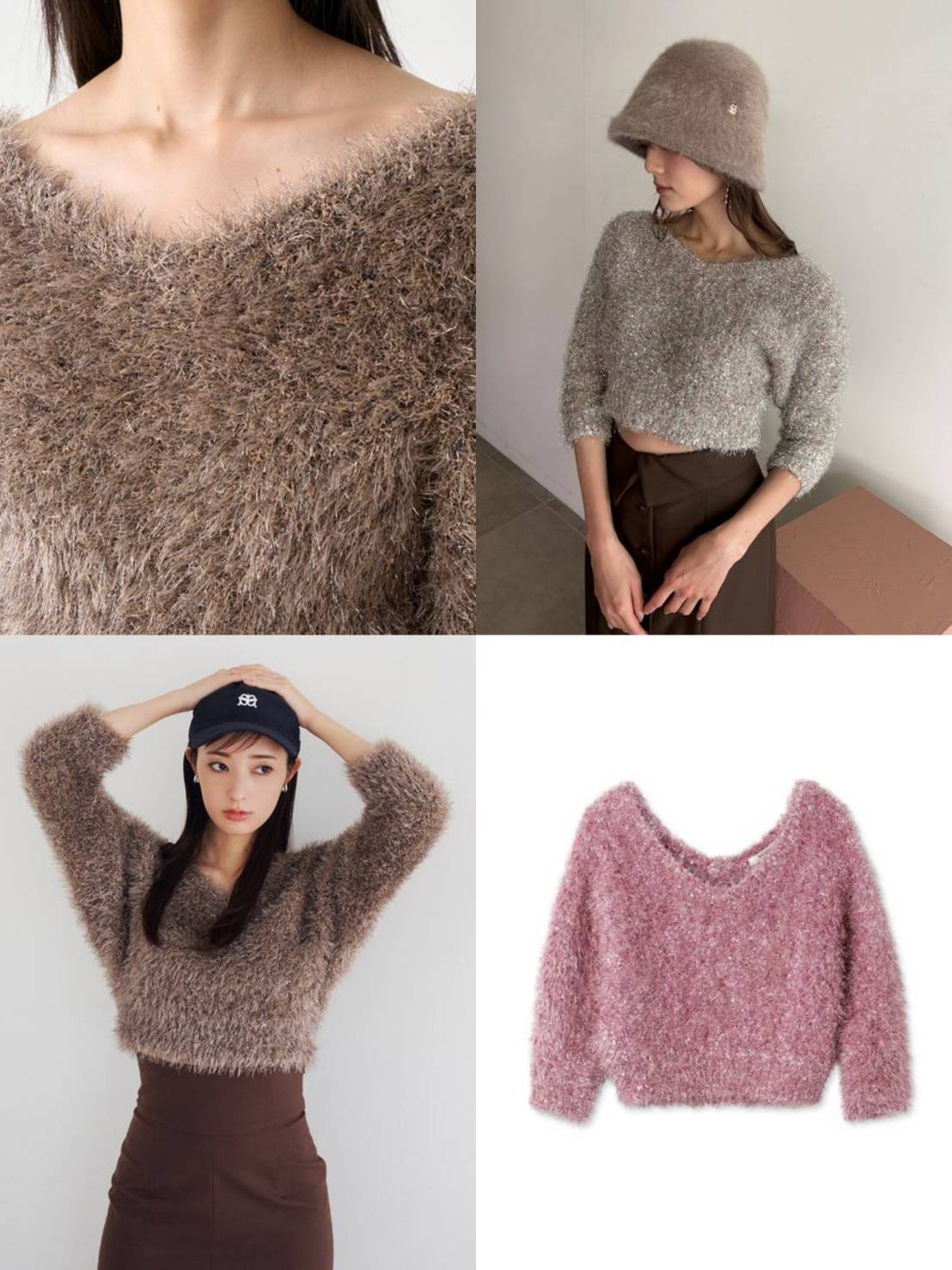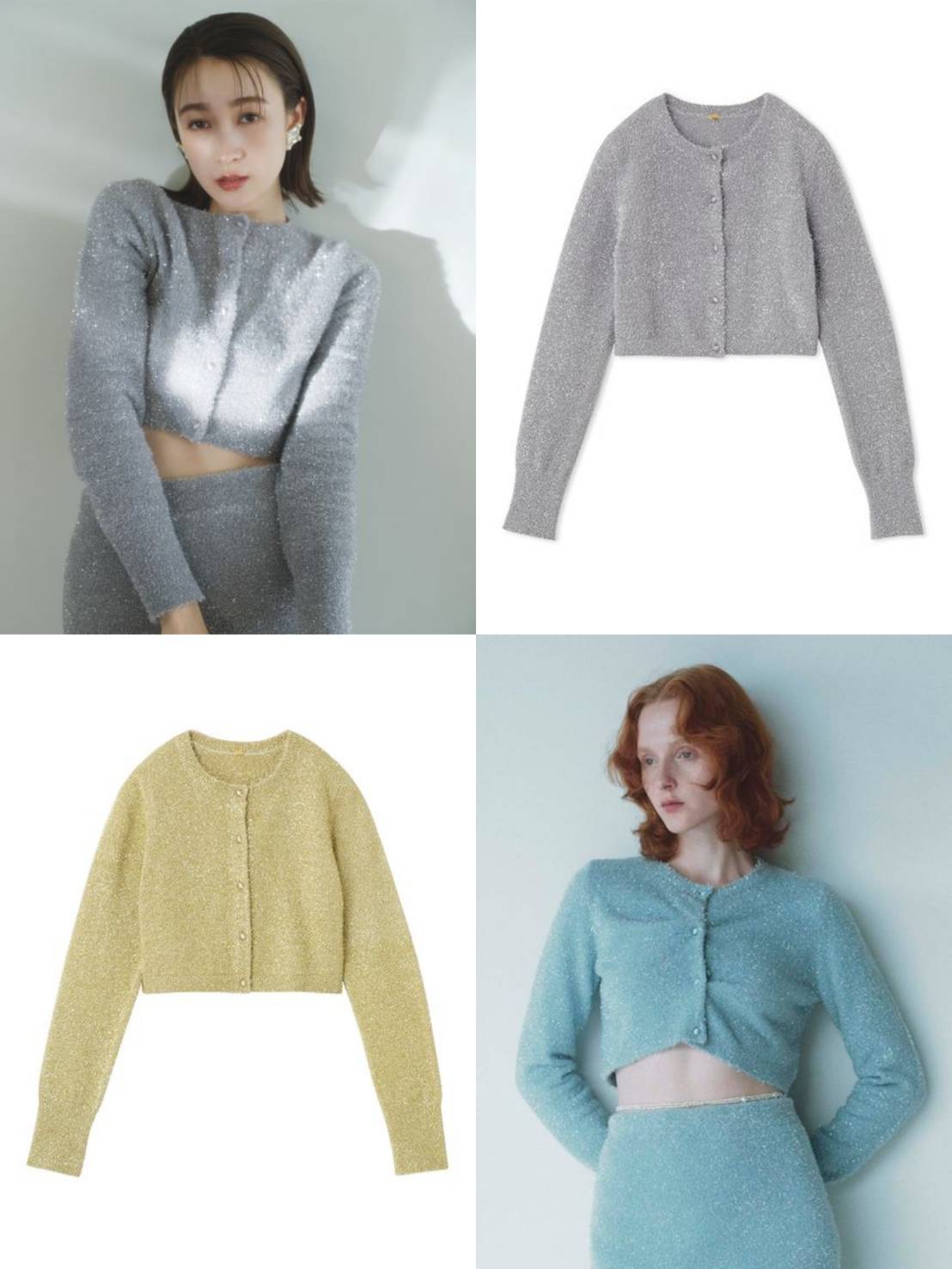 お腹がしっかり見えるクロップド丈のラメニット。カーディガンの他に、同素材のスカートもあり。ポップな色展開(ピンク、「ブルーイエロー、グレー全4色)あるのも楽しい。フェザーラメニットクロップドカーディガン/リリーブラウン