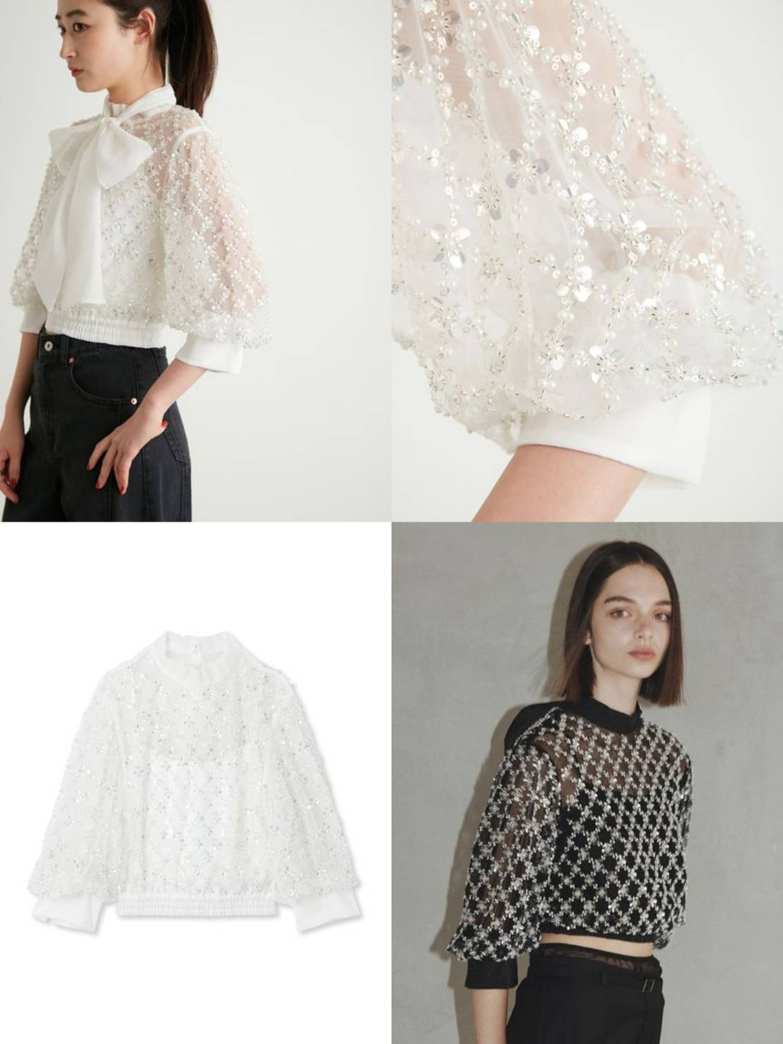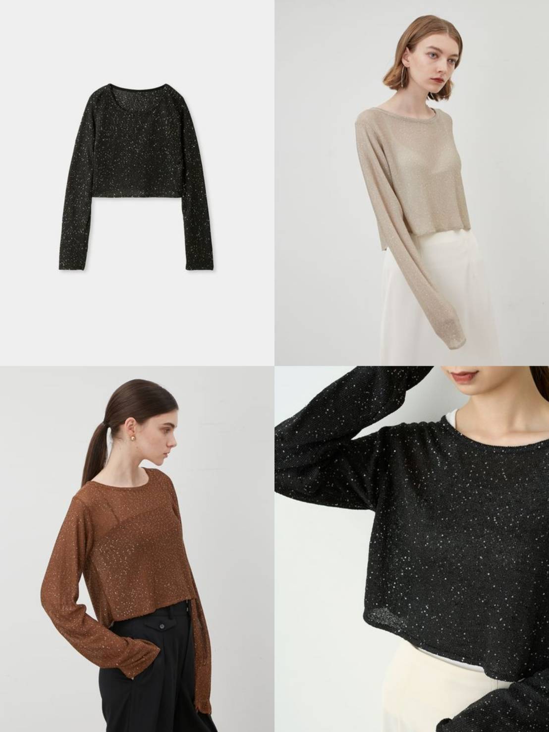こちらも同素材のスカートもある、シアーニットトップス。透け感のある素材とラメの相性が意外にもぴったり。ジャケットのインナーなどにはもちろん、主役使いにも。スパークルシアーニットトップス/ミースロエ