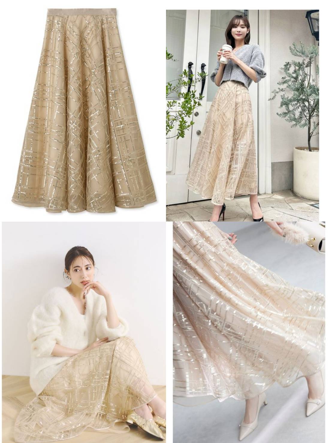 現在大ヒット中のこちらのスカート。色や柄によってキラキラの仕様が変わっているのですが、特に繊細な華やかさで人気なのがこのベージュ。使っている糸や生地も艶やかなので、見た目以上にエレガント。バリエチュールフレアスカート/セルフォード