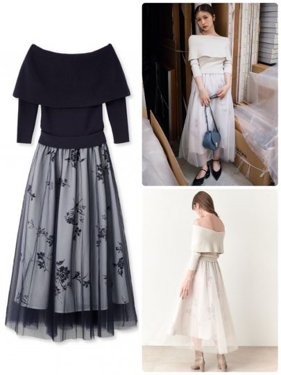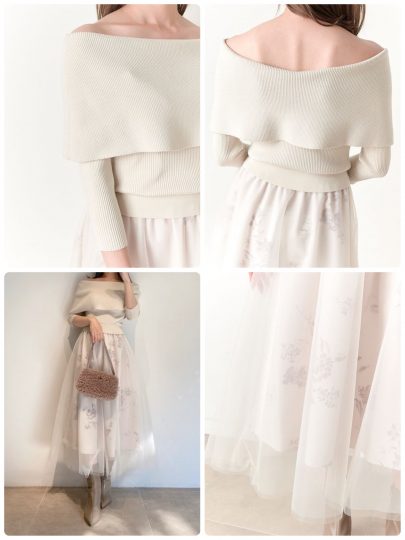 オフショルデザイントップスにチュールスカートを組み合わせた1枚。