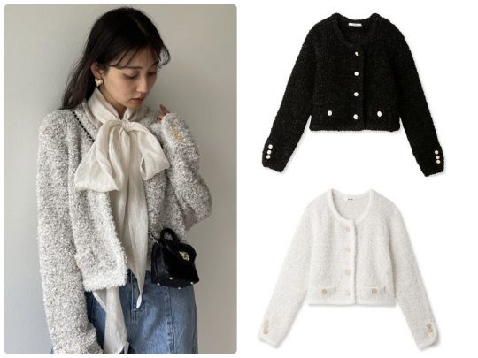 ふわふわ質感のラメ入りニットを使用したツイードライクカーディガン。デニムなどのカジュアルなボトムに合わせても、纏った瞬間にコーデが上品な印象に華やぎます♡