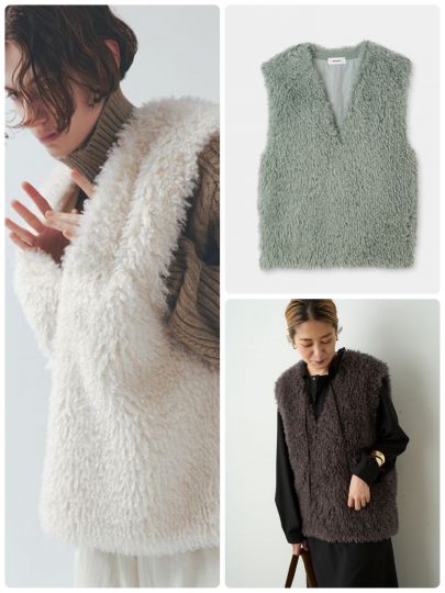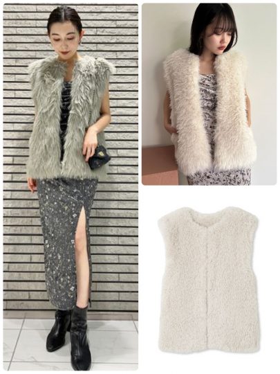 ボリューム感たっぷりのフラッフィー素材のフェイクファージレ。ほどよいオーバーサイズシルエットで華奢見えを叶えてくれるのも魅力。