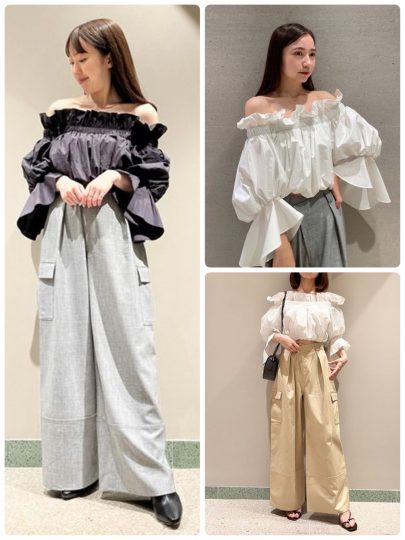 ふんわりとしたバルーンシルエットが気になるウエスト周りを華奢にメイク。また袖のフレアデザインに前後差をつけることで、重たくならないように工夫をこらしてるんです。