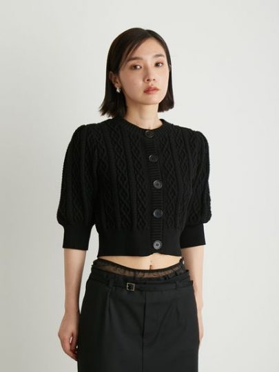 トップスはもちろん、羽織りとしても活躍するので便利♡立体的なケーブル柄がコーディネートにアクセントを与えてくれます。フロントのクリアボタンもポイント!