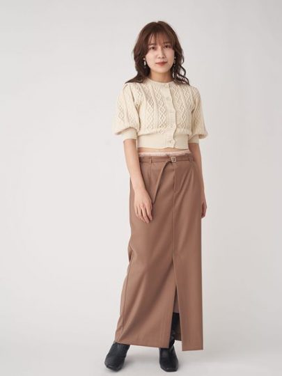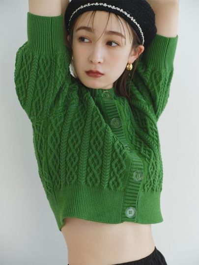 コンパクトな丈感ですが、ハイウエストボトムであればINできる丈感に仕上げています。ほんのりふわっと仕上げたパフスリーブ、ウォーミーなざっくり編みニットで女性らしさも満点。