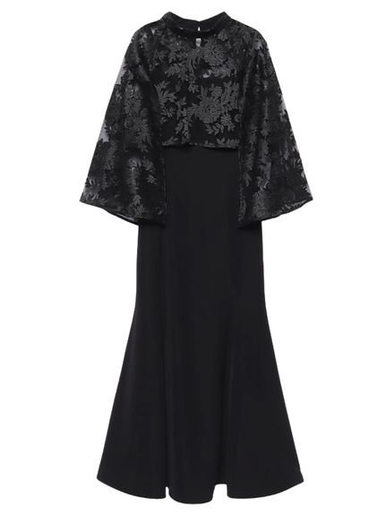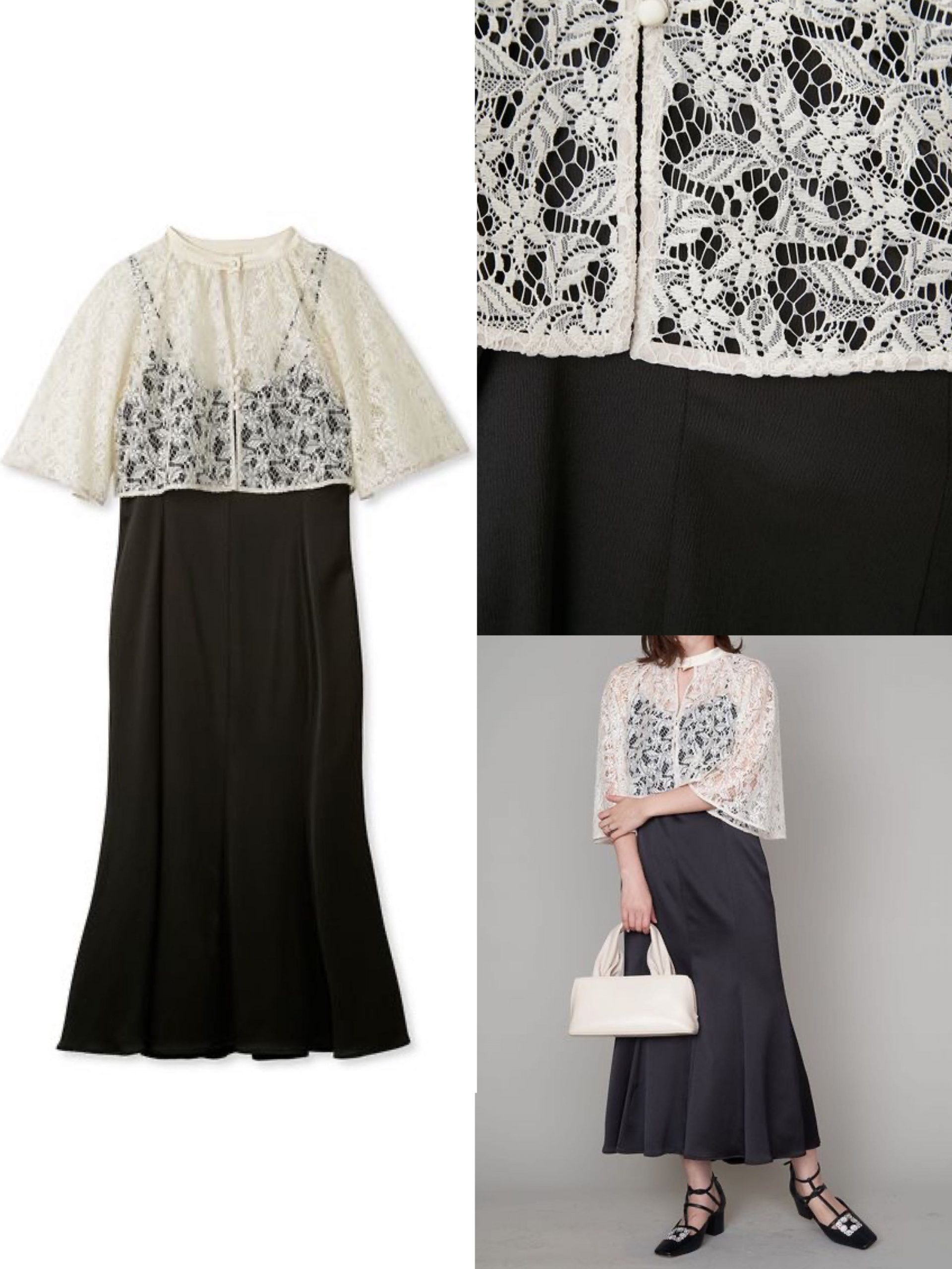 レースのケープ風トップスとキャミワンピースがセットになった、重厚感のある1枚。ケープ風のデザインやサイズ感など今年らしい要素が詰まったトップスなので、シンプルなドレスに合わせても華やか。