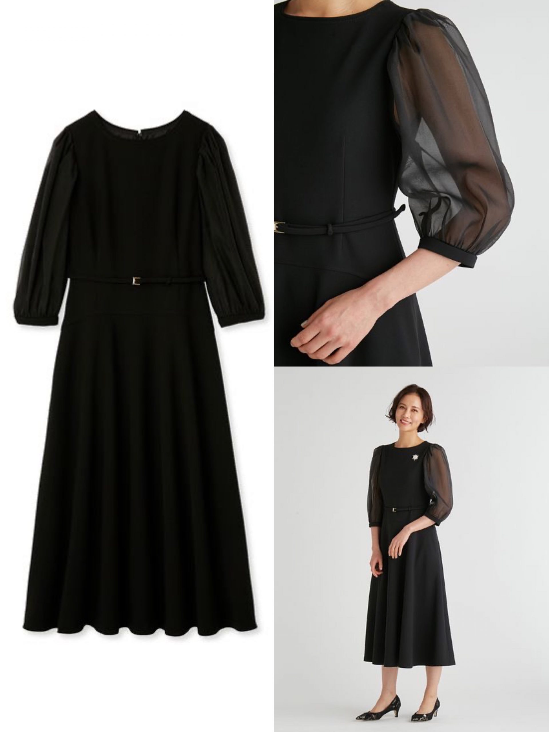 フォーマルな7分丈のシアーな袖がついた、ベルト付きワンピース。ベルトを外すとリラックス感のあるシルエットになり、カジュアルなシーンでも楽しめるようになっています。伸縮性のある生地なので、窮屈さもなし。