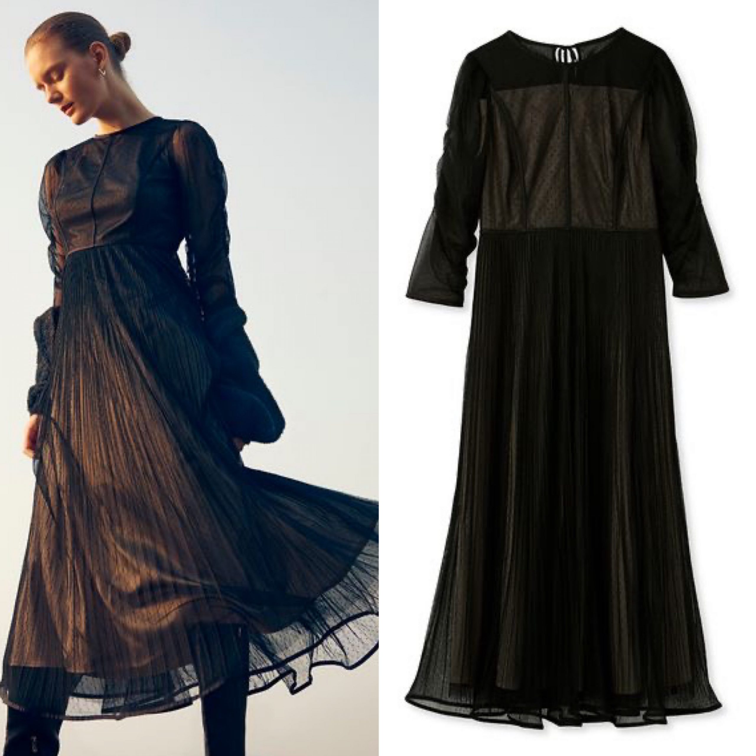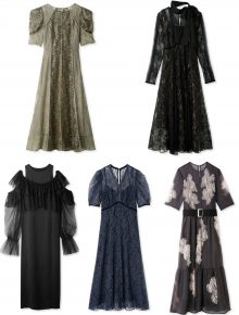 2万円以内で手に入る、コスパも素晴らしい総レースワンピース。キラキラしたラメが生地にブレンドされているので、黒でも華やか。特にデコルテ周りはシアーな仕上がりになっているので、女性らしさも旬度も満点。