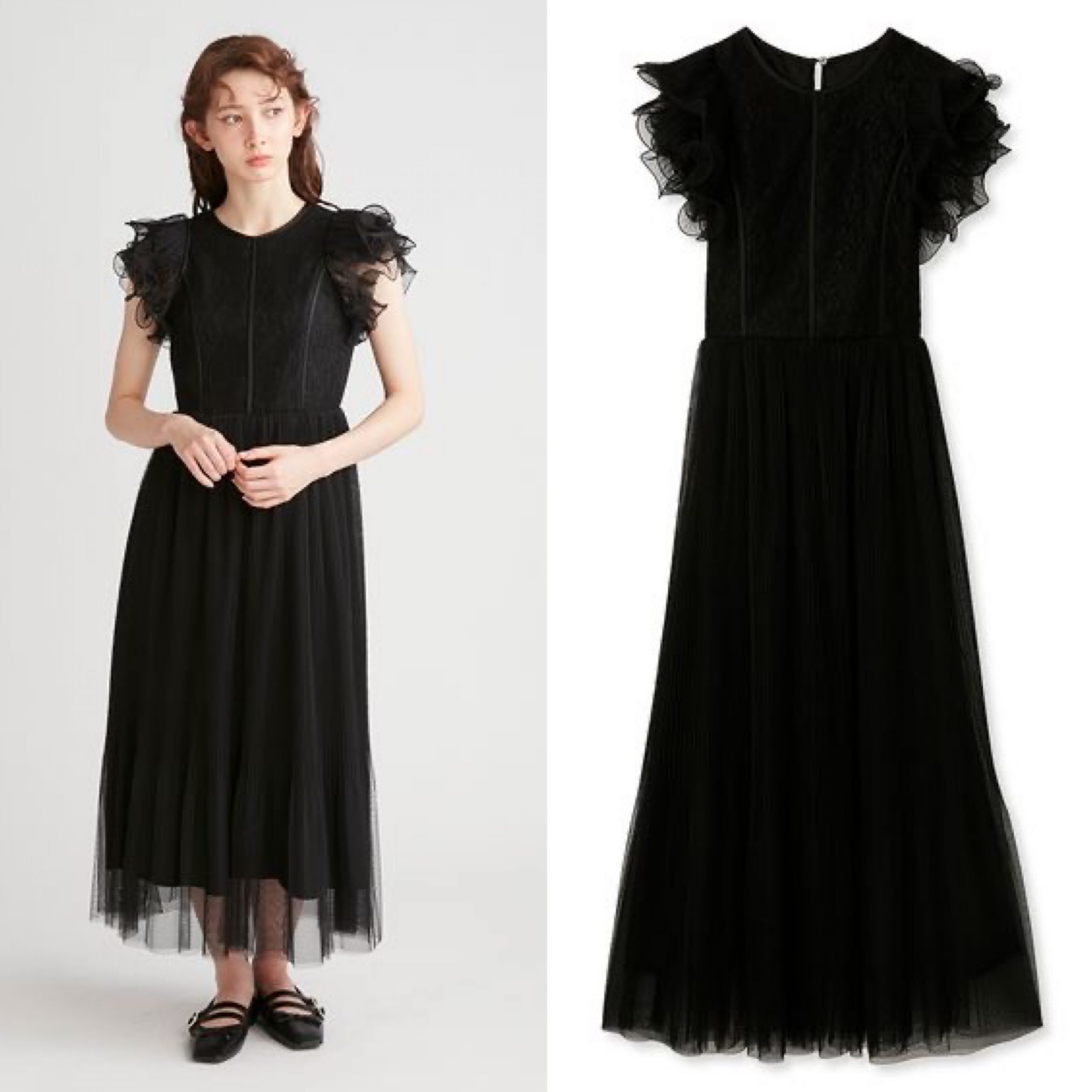 たっぷりの立体的なラッフルが二の腕をふんわりとカバーしてくれる、上品なチュール&レーススワンピース。スカート部分のチュールは細かなプリーツが上部に施され徐々に消えていくタイプなので、縦のラインが強調されてほっそり見えるのも嬉しい。