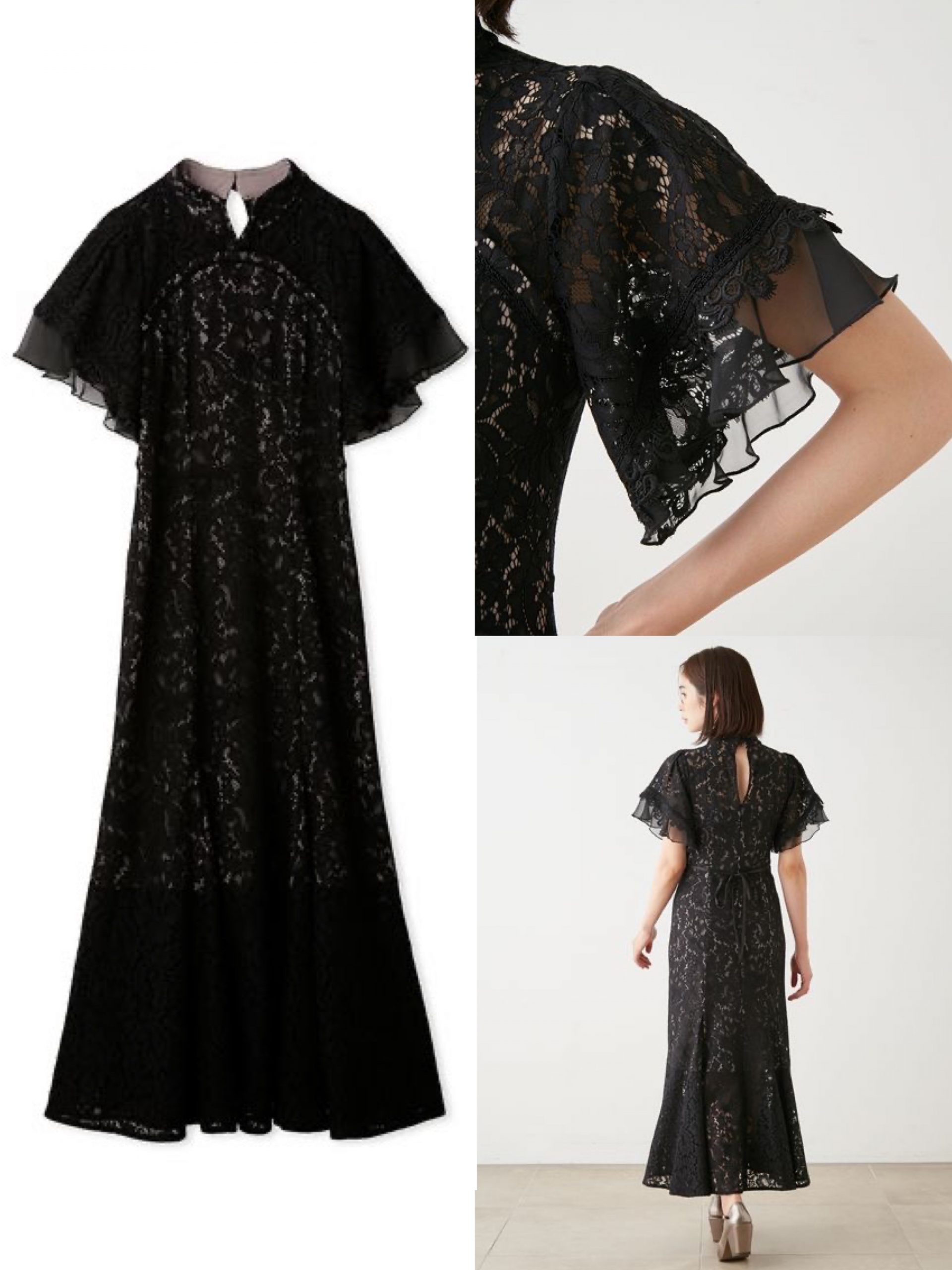 繊細なフラワー柄レースが可憐な印象を高めてくれる、人気のチャイナドレス風のブラックワンピース。マーメイドラインの裾も今年らしい、軽やかでラグジュアリーな1枚です。