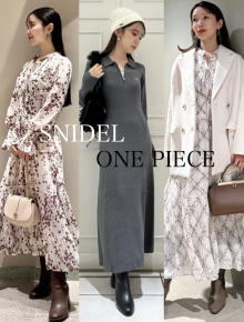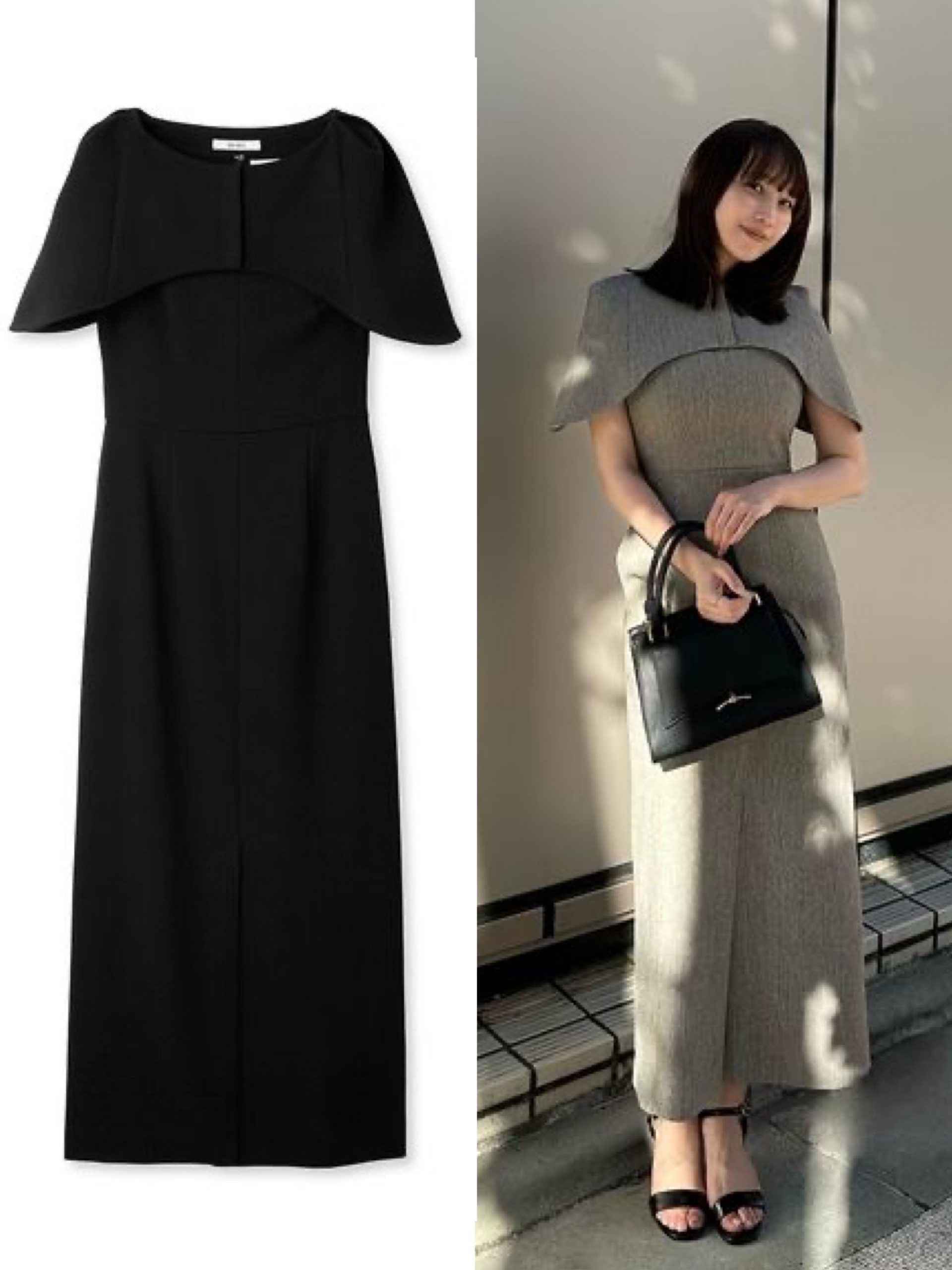 淑女風のミモレ丈のタイトドレスに、取り外し可能なケープが付いたレディーライクなセット。カーブにカットされたラインやウールタッチのヘリンボーン調の生地など、クラシカルな要素が詰まった鮮度が高いアイテムです。