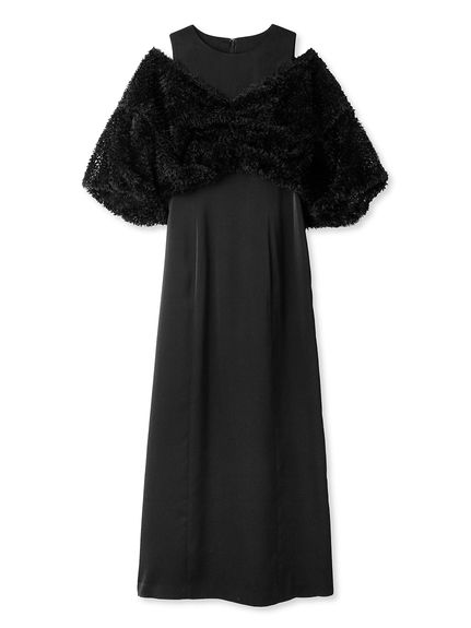 シフォンの生地を細長くカットしてフェザー調に仕上げたボリュームのあるトップスと、シンプルなノースリーブドレスがセットになった、遊びが効いたパーティー仕様ワンピース。特別なお呼ばれシーンにおすすめ。