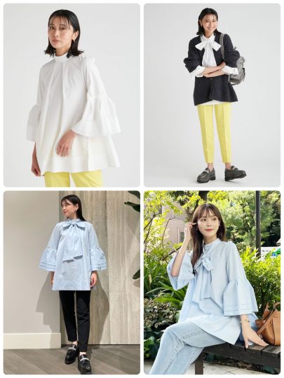 全体的にボリュームを持たせたシルエットで腰回りをすっぽりとカバーしてくれます。ゆとりのあるサイジングながらも、ベルスリーブデザインとビッグリボンが上品さも演出。ちなみにリボンは取り外し可能です。