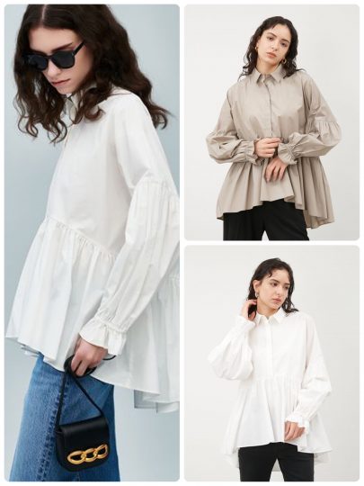 ナチュラルに腰回りをカバーしてくれるペプラムフレアデザインがポイント。袖口にはゴムを施しているので、腕まくりをしてボリューム感を調節することも可能です。シンプルにパンツと合わせるのがおすすめ。