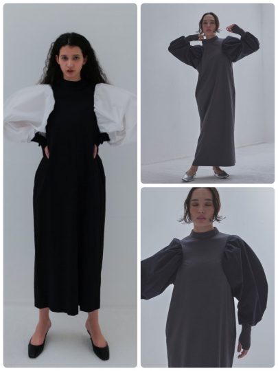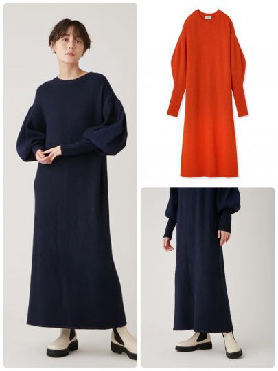 ストンとしたシルエットがキュートなニットワンピ。ボリューミーな袖デザインでまるでアームウォーマーを着用しているよう。