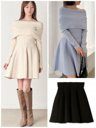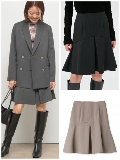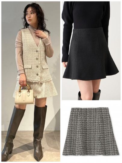 レディな雰囲気のツイード素材なら、ミニ丈でも品よく大人っぽく着こなせます。裾に向かって広がるフレアなシルエットとの対比で、脚がほっそり見えるのも高ポイント。
