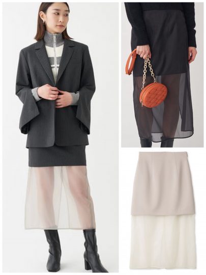 シンプルなミニスカ+シアーな長め丈スカートの2点セット。脚線が曖昧になるので、脚を出すのに抵抗がある人もトライしやすいデザイン。どちらを上に重ねるかでも印象が変わります。