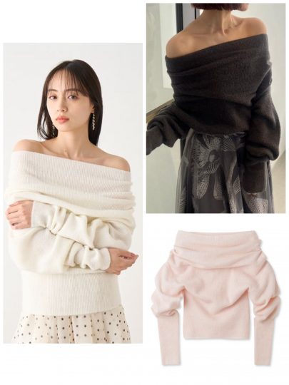 袖も襟もたっぷりめで、くしゅくしゅたるませて着るルーズ感が可愛い。ふわっと柔らかな質感のニットが「守ってあげたい」感を強調します。