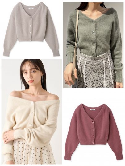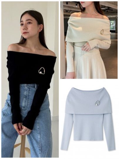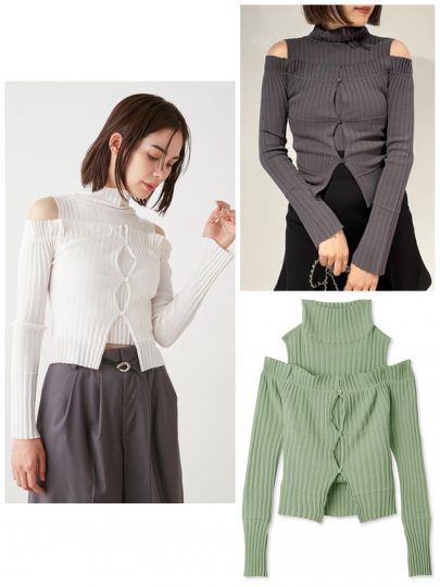 ハイネックのノースリトップス+オフショルカーデのセットは、重ねて着ると肩がチラ見えするデザイン。タイトなサイジングやクロップド丈が今年らしい。
