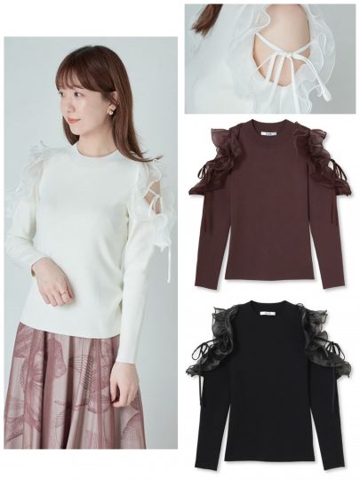 ショルダーのカットアウトにフリルやリボンを飾り、シンプルニットに華やぎを加えました。透け感のある素材をMIXして繊細なフェミニンさを演出。