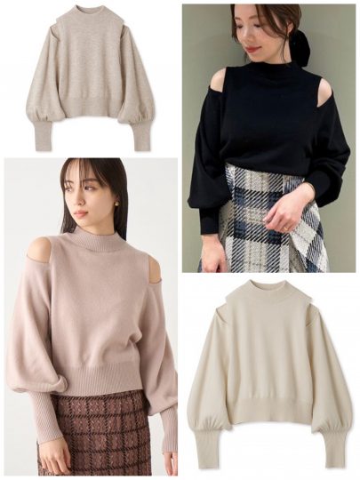骨っぽさのある肩部分に大きめなスリットを入れることで、華奢見えが叶うニット。首の詰まった形で他は露出を抑えているので、肩出しが際立ちます。