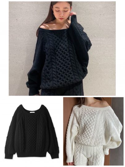 カジュアルなイメージの強いケーブルニットも、肩を落として着ると一気に女度がアップ。ゆるっとしたフォルムのドルマンスリーブでリラクシーに。