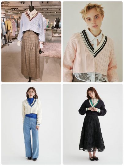 左右で異なる編み地や配色に。シャツやハイネック…合わせるインナー次第で表情が見違えます。プレッピーながらもモードな雰囲気、シンプルなボトムとの組み合わせもサマになります。