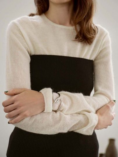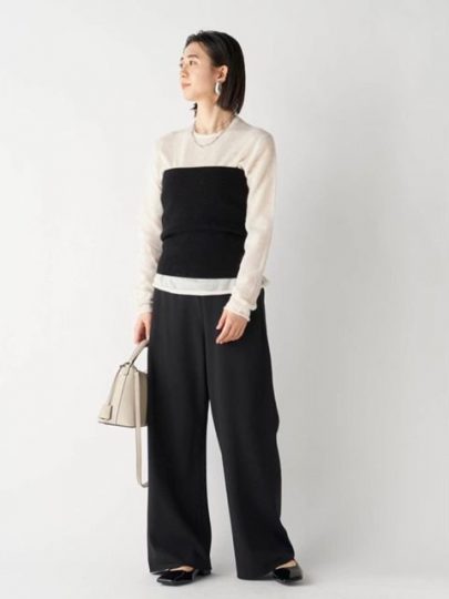 シアー感のあるモヘア素材のインナーと、ウール素材のリブ編みベアトップを組み合わせたトレンド感あふれるセットアイテム。優し気なモヘアトップスとモードな印象のベアトップのコントラストが女性らしく、スタイリングに奥行きをプラスしてくれます。シアーニットは単品でロングTシャツ感覚で着用でき、ベアトップはカットソーやシャツとのレイヤードもおすすめです。